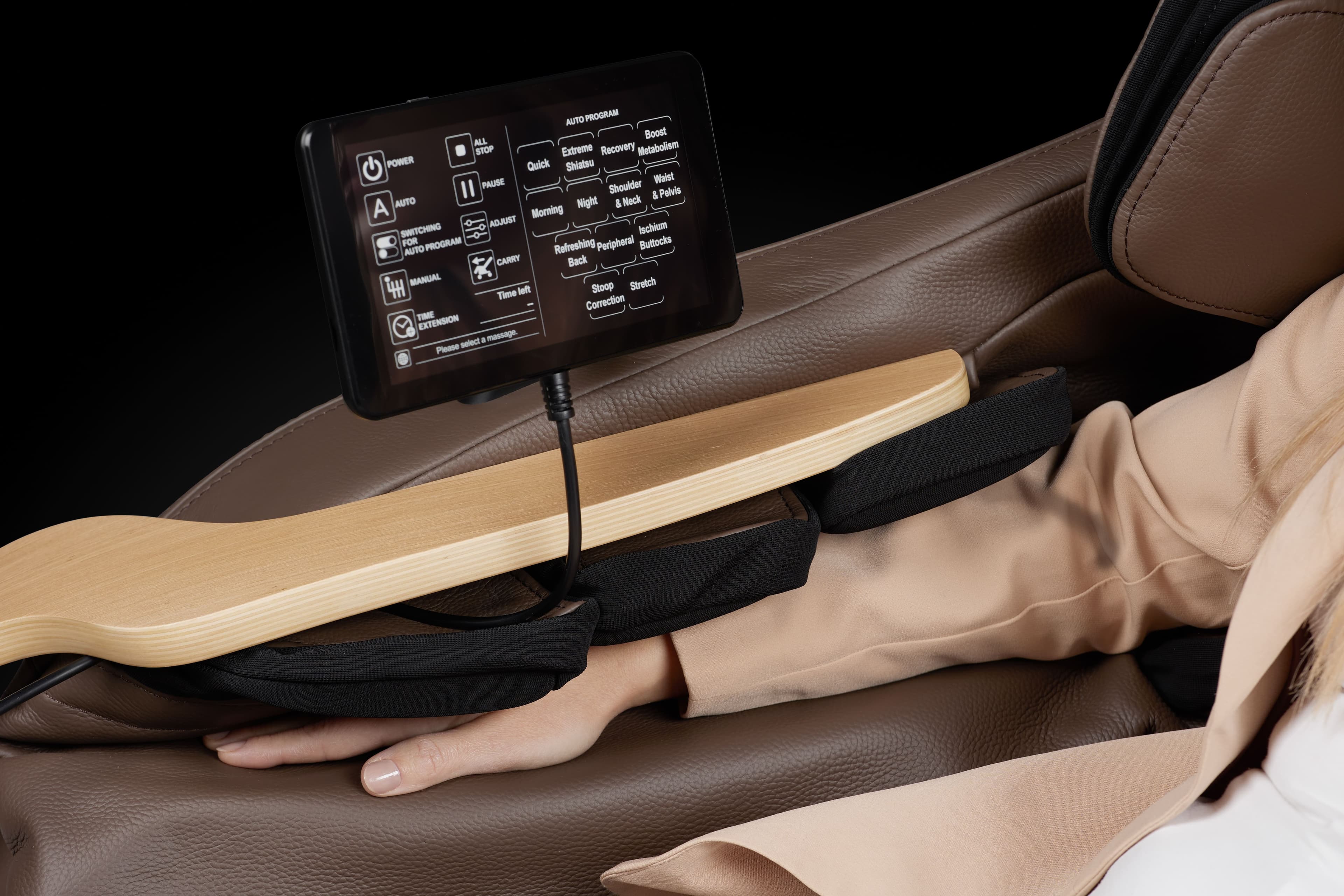 Das Touchscreen-Display vereinfacht die Steuerung und Personalisierung der Massagesitzungen. Die Steuerung des Sessels ist einfach, dank der Tablet-Oberfläche und der Shortcut-Tasten am linken Arm des Sessels. Dies ermöglicht eine schnelle Anpassung der Einstellungen und maximalen Komfort zu jeder Zeit.